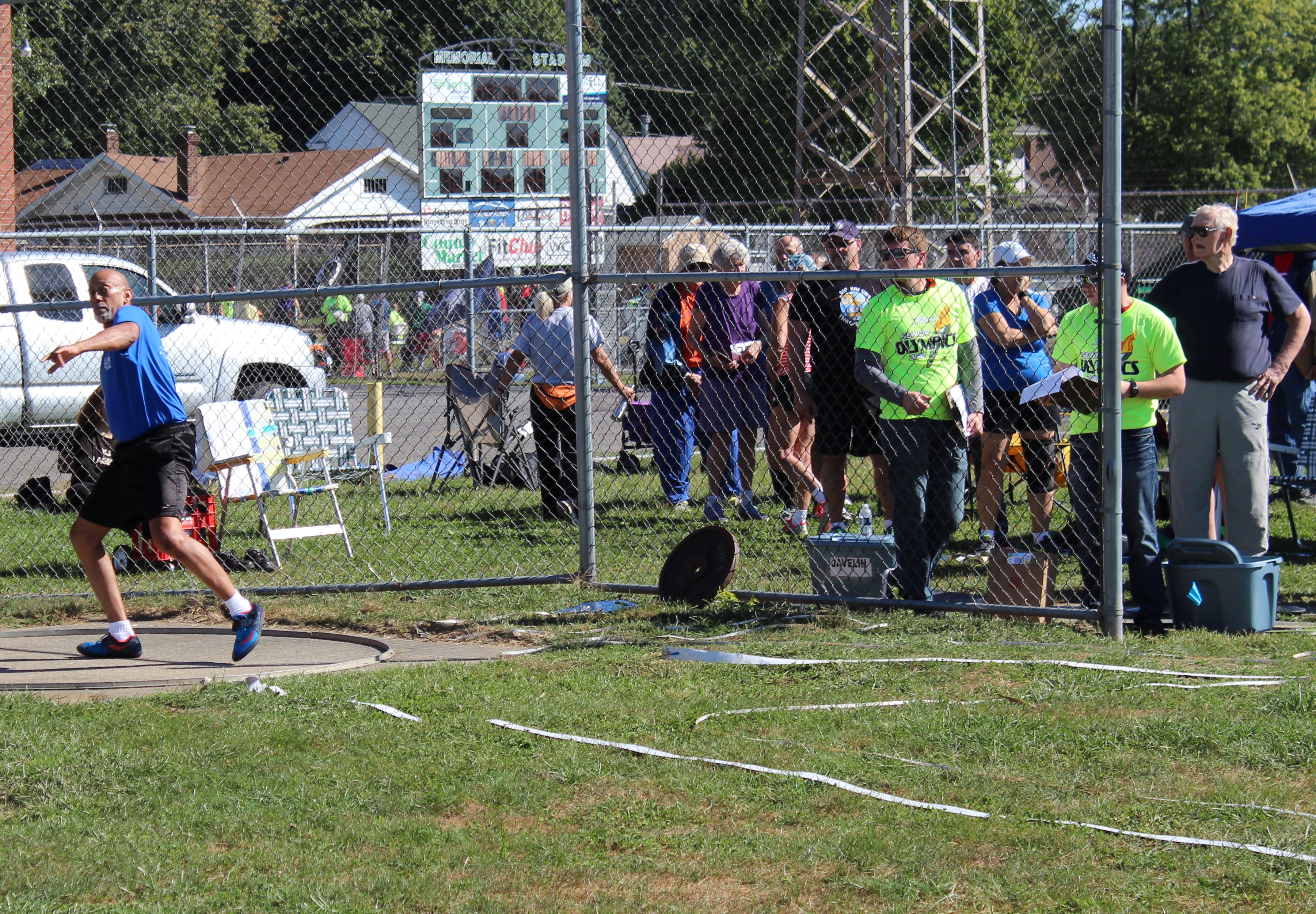 If you’ve followed this blog, you may feel the Illinois Senior Games series could be subtitled “Stalking Marty Morris”. Actually, the guy was everywhere that weekend. At the track meet, Marty helped measure and record distances for the discus throwers. There is more skill involved than balancing a clipboard while rolling the disc back to participants. A thrower’s appearance is not a good indicator of how far the disc will travel or how near the segment it will land. And each thrower wants their effort marked and recorded accurately, or at least no less than their perceived distance.