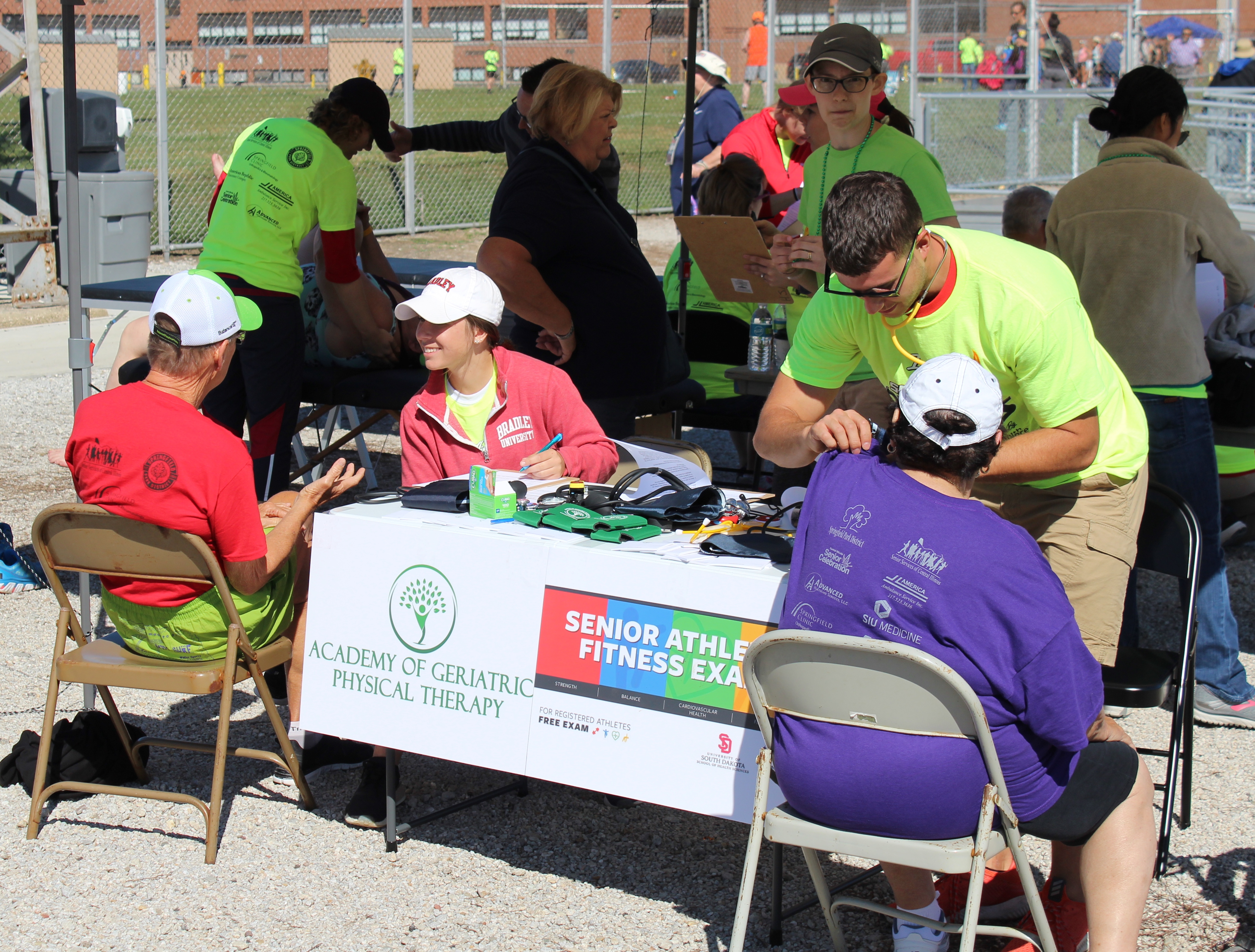 A big thank you goes out to the Illinois Senior Olympics and students from Bradley University for providing free screenings to participants at the track. Flexibility, balance, gait and range of motion were measured along with heart rate and blood pressure. The screenings were in conjunction with a study through the Academy of Geriatric Physical Therapy.