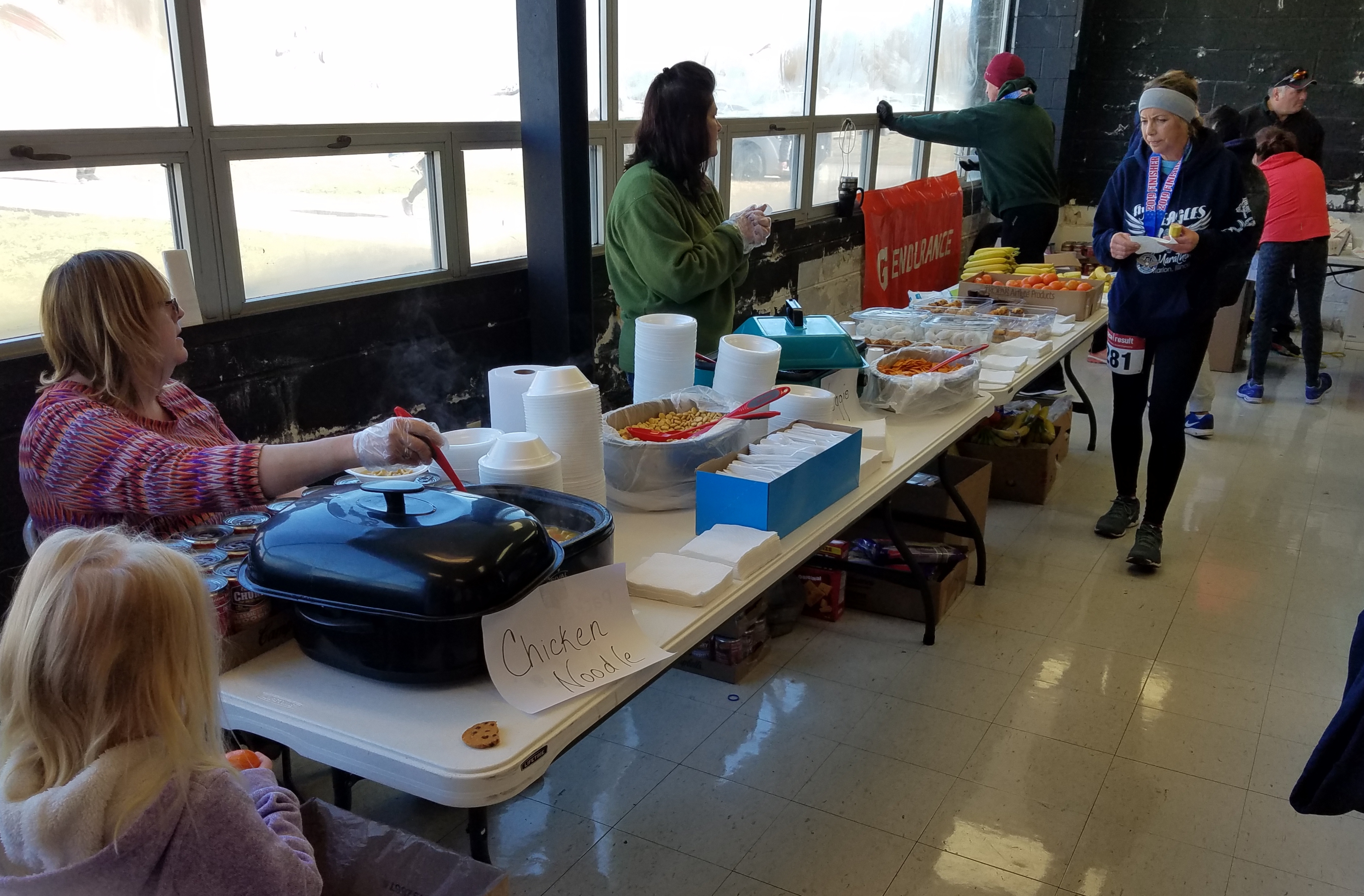 Post-race food included soup and hot drinks to help runners combat the frigid outdoor temperatures. Fruit, sweets and salty snacks provided a variety of nourishment to replenish depleted bodies. The hooded sweatshirt given to all runners came in handy for those needing a dry layer for warmth after the run. River to River Runners do an excellent job of organizing, administering and directing the winter run. The race was professionally timed by Southern Illinois Racing with results available immediately.