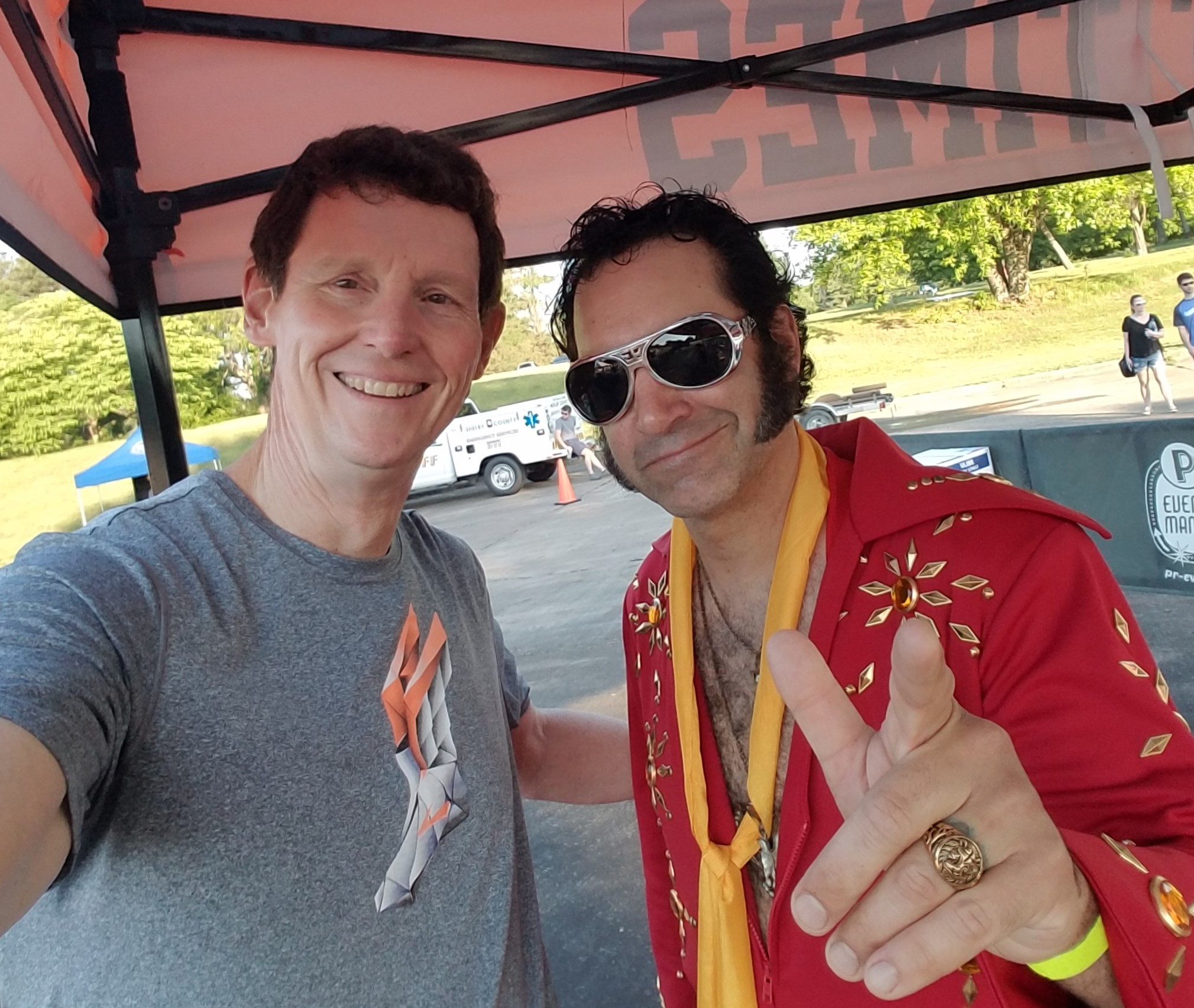 In true Memphis style, ‘the king’ was an ever-present encourager and supporter of participants. I’ve heard many called the hardest working performer in show business, but Jeff Sass lived up to that title, clothed in Elvis jumpsuit finery. He greeted athletes as they arrived to set up transitions, he sang the National Anthem prior to race start, he pointed the way through transition, he cheered on finishers and was readily-available for selfies and podium pictures. Through the heat of Saturday and the drizzle of Sunday, he was always working it.