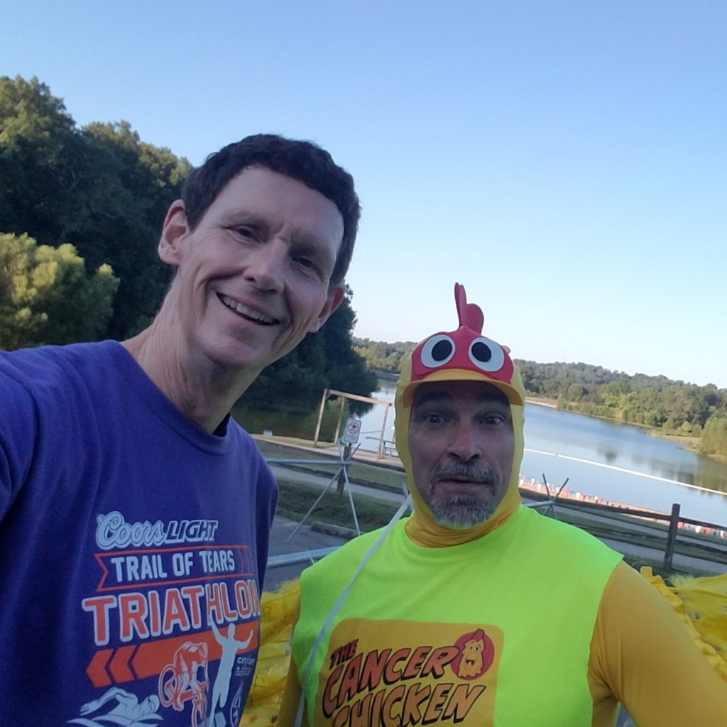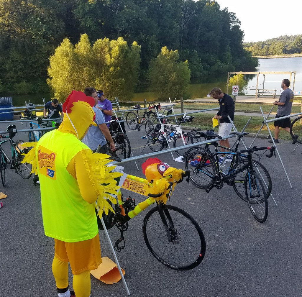 While setting up my transition, a man in yellow approached. Head to toe yellow with feathered wings, the Cancer Chicken was hard to miss. Actually, his shoes and the tip of his head were red like any respectable chicken. Kevin Hand introduced himself and told me this was his first triathlon but that he had run the Chicago Marathon in the chicken suit. A stage four colon cancer survivor, Kevin dons the costume to raise awareness of the disease and to bring joy to those in the battle. “Nothing is more boring than sitting through those four-hour infusions with nothing to do but think about your life”, Kevin said. So monthly he returns to the cancer center as the Cancer Chicken to lighten the mood and share some hope with the patients going through the same things he recently experienced.