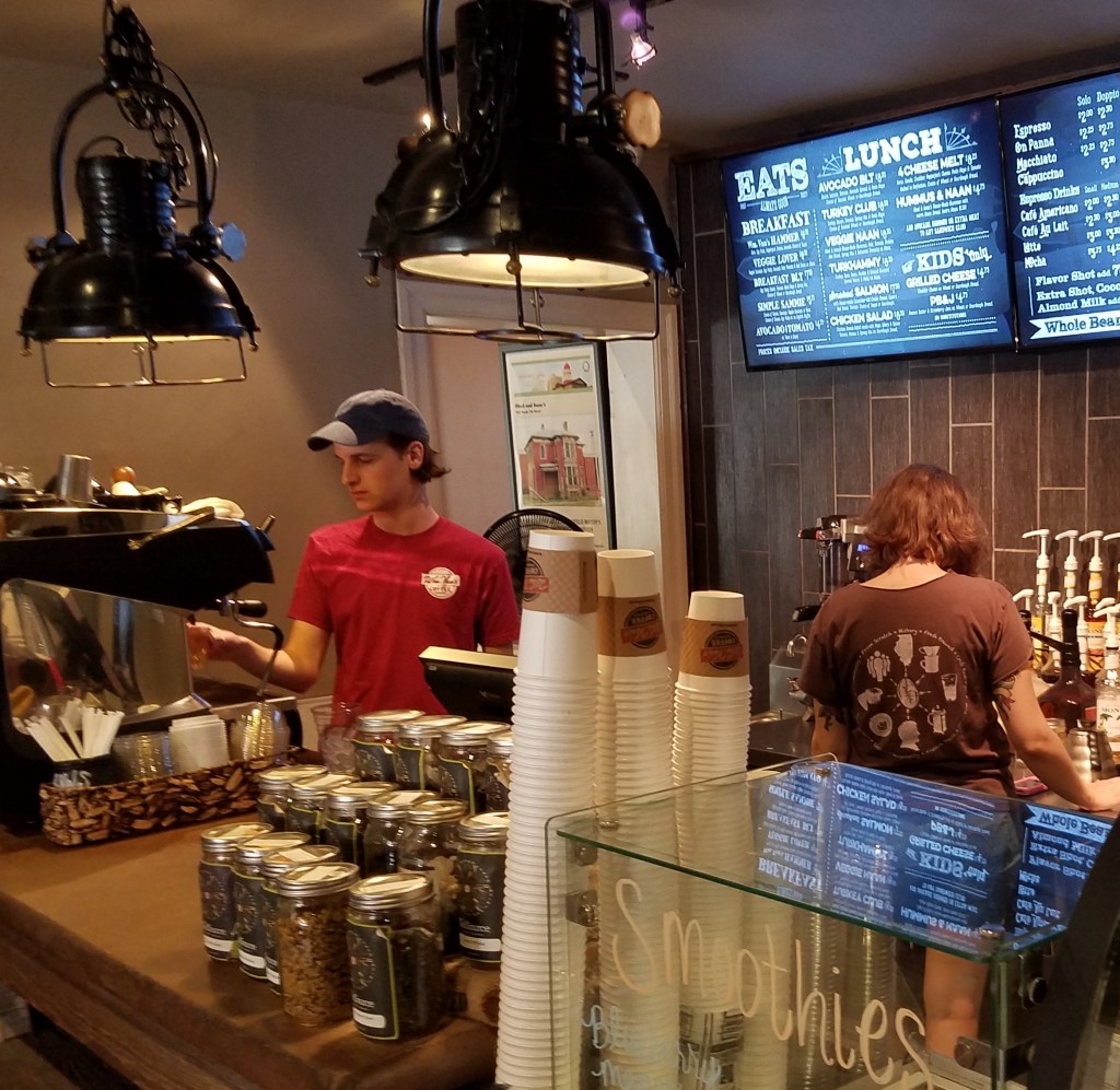 The interior features a variety of seating options in rooms that create private, comfortable spaces to enjoy food, beverages and conversation. The service counter is compact but appears to be designed for staff efficiency. Menus and display cases are close to help patrons make decisions regarding their food and beverage choices.