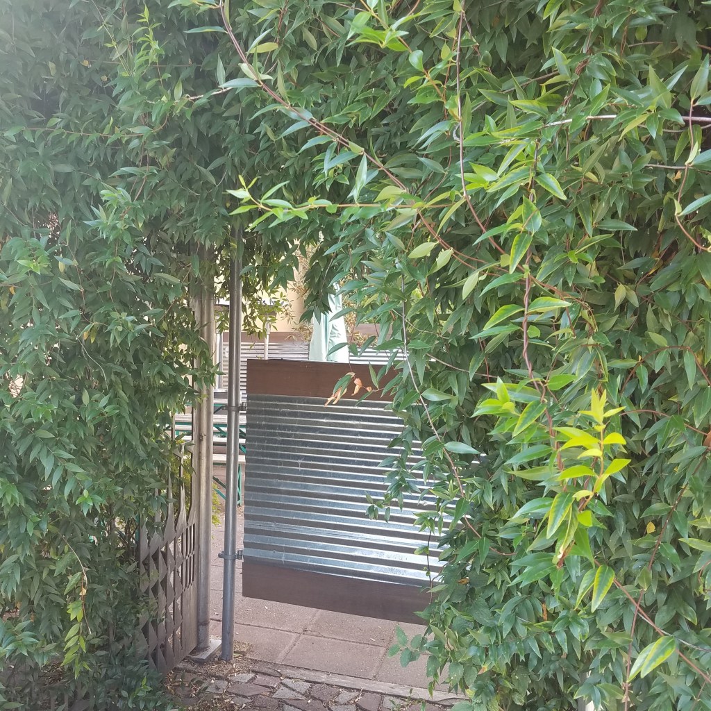 Entrance to outdoor seating at Mean Mug Coffeehouse on West Main St.